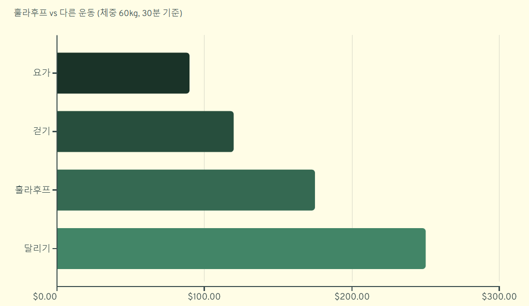 훌라후프의 다이어트 효율을 다른 유산소 운동과 비교해 보았습니다. (체중 60kg, 30분 운동 기준)