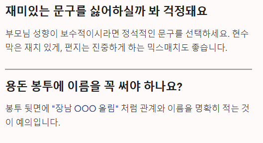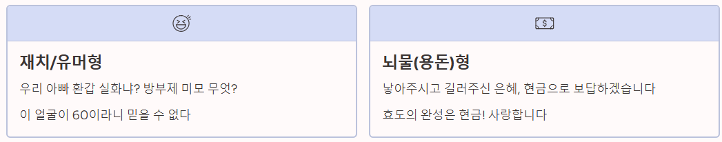 | 뇌물(용돈)형 | 낳아주시고 길러주신 은혜, 현금으로 보답하겠습니다. / 효도의 완성은 현금! 사랑합니다. | 용돈 박스 전달 시 |