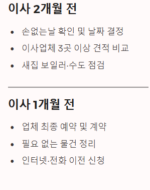- 수도 동파 확인: 이사 들어갈 집의 보일러와 수도계량기가 얼지 않았는지 계약 전이나 이사 며칠 전에 미리 방문하여 확인해야 합니다.