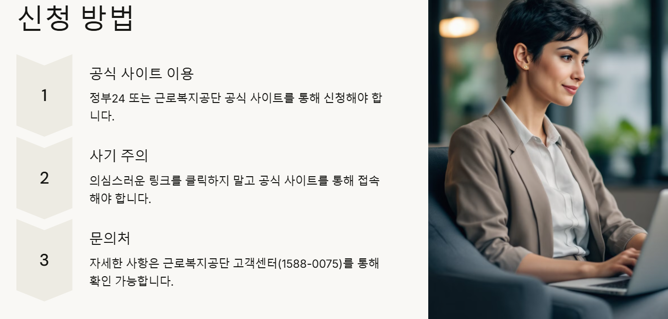 반드시 정부24 또는 근로복지공단 공식 사이트를 통해 신청해야 합니다.