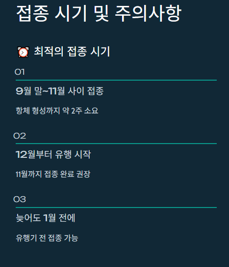 - 최적의 접종 시기: 9월 말 ~ 11월 사이