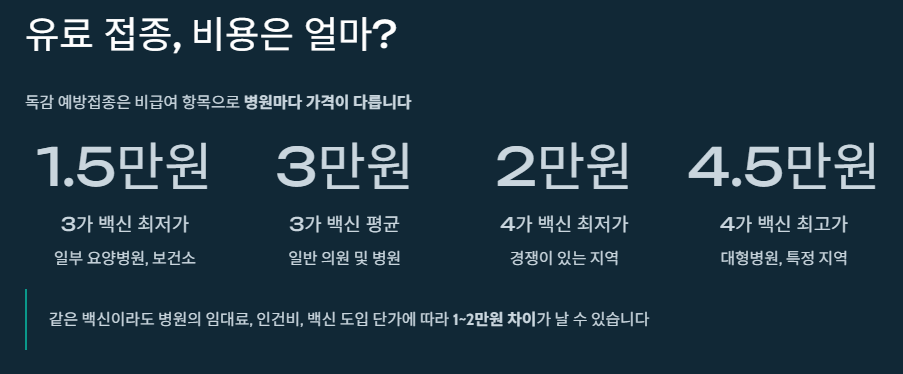 - 4가 백신 (유료): 평균 2만 원 ~ 4만 5천 원 내외