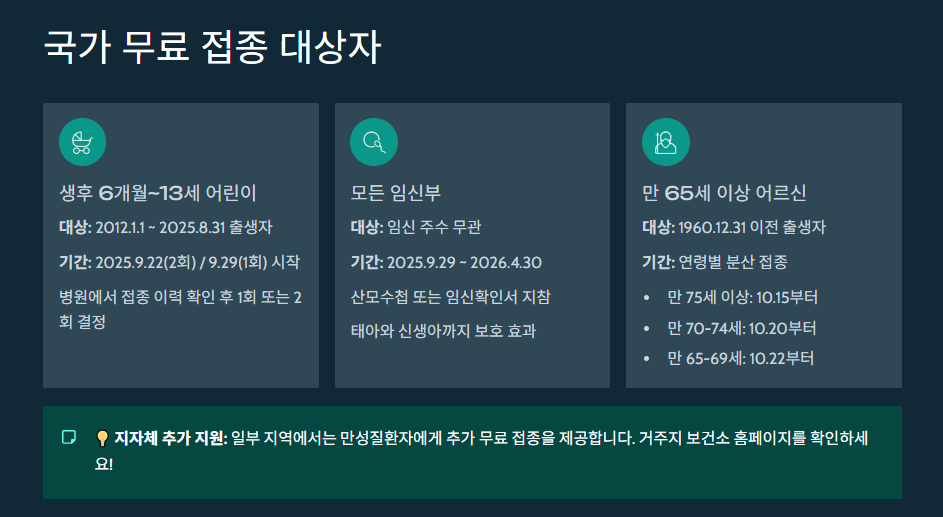 - 접종 기간: 2025년 9월 29일 ~ 2026년 4월 30일