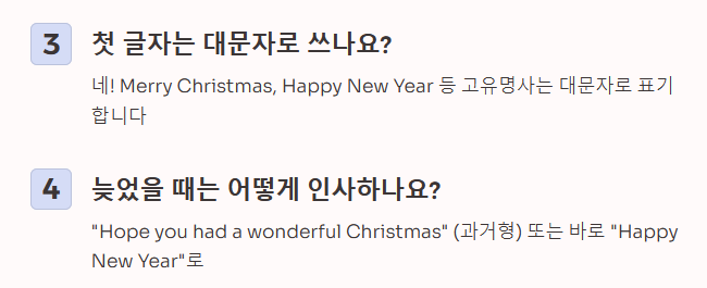 Q4. 늦었을 때 보내는 인사는 없나요? 크리스마스가 지났다면 "Hope you had a wonderful Christmas" (멋진 크리스마스를 보냈기를 바라)라고 과거형으로 쓰거나, 바로 새해 인사인 "Happy New Year"로 넘어가는 것이 자연스럽습니다.