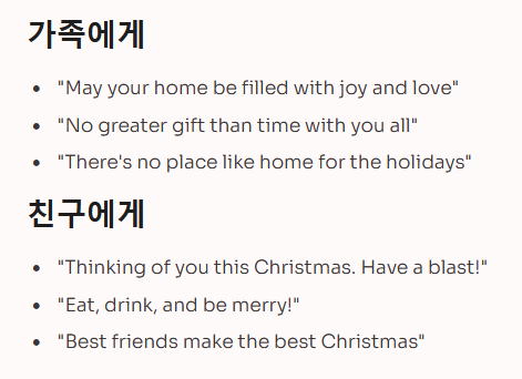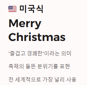 - 기본 인사: Merry Christmas! (미국), Happy Christmas! (영국)