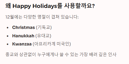 - 포괄적 인사: 종교와 무관하게 모두를 아우르는 Happy Holidays!
