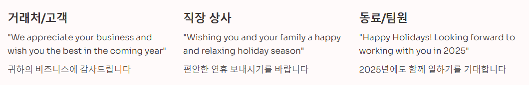 | 동료/팀원 | Happy Holidays! Looking forward to working with you in 2025. | 즐거운 연휴 보내세요! 2025년에도 함께 일하기를 기대합니다. |