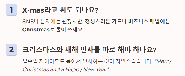 Q1. 카드에 'X-mas'라고 써도 되나요? 'X-mas'는 그리스어에서 유래한 약어이지만, 현대 영어에서는 다소 비격식적이고 상업적인 느낌을 줍니다. 문자 메시지(SNS)나 좁은 공간에 쓸 때는 괜찮지만, 정성스런 카드나 비즈니스 메일에는 Christmas라고 철자를 풀어서 쓰는 것이 예의입니다.