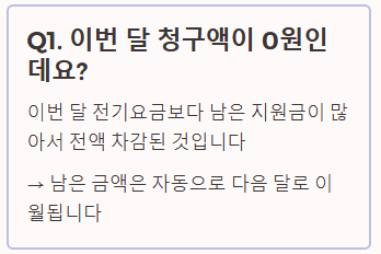 Q1. 이번 달 청구 금액이 0원인데 잔액은 어디서 보나요? 청구 금액이 0원이라는 뜻은 **[이번 달 전기요금 < 남은 지원금]**이라서 전액 차감되었다는 뜻입니다. 이 경우 고지서 상세 내역을 보면 이번 달 요금만큼 차감된 내역이 보이고, 남은 돈은 자동으로 다음 달로 넘어갑니다.