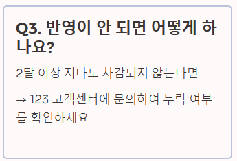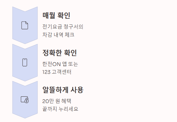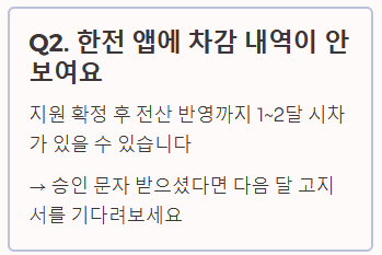 Q2. 한전 앱에 들어갔는데 차감 내역이 안 보여요. 지원이 확정되었더라도 전산 반영까지 1~2달 정도 시차가 있을 수 있습니다. 승인 문자를 받으셨다면 걱정하지 마시고 다음 달 고지서를 기다려보세요. 그래도 안 나온다면 123 고객센터에 문의하여 누락 여부를 확인해야 합니다.