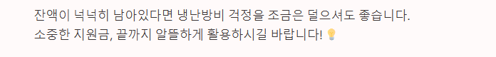 아직 잔액이 넉넉히 남아있다면, 다가오는 여름철/겨울철 냉난방비 걱정을 조금은 덜으셔도 좋습니다. 20만 원이 모두 소진될 때까지 알뜰하게 혜택을 누리시길 바랍니다.