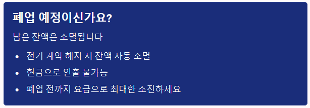 Q3. 잔액이 남았는데 폐업하면 돌려주나요? 아니요. 전기 사용 계약이 해지(폐업)되는 순간 남은 잔액은 소멸됩니다. 현금으로 인출할 수 없으니, 폐업 전까지 최대한 전기요금으로 소진하는 것이 이득입니다.