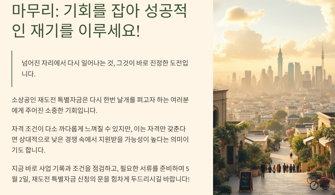 정보가 곧 기회입니다. 특히 재도전 특별자금은 상대적으로 경쟁이 덜할 수 있으니, 조건만 충족한다면 망설이지 말고 도전해 보세요!