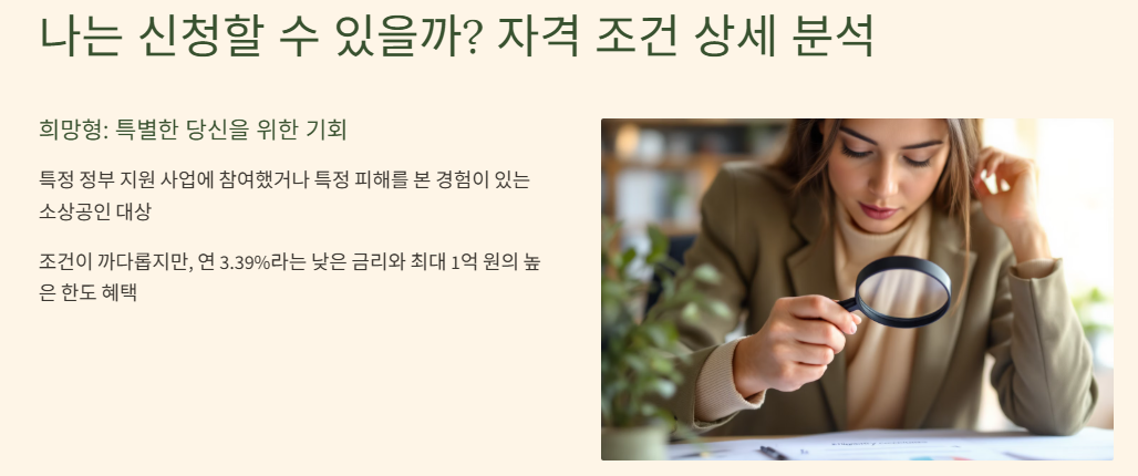 희망형은 특정 정부 지원 사업에 참여했거나 특정 피해를 본 경험이 있는 소상공인을 대상으로 합니다. 조건이 다소 까다롭지만, 해당된다면 연 3.39%라는 낮은 금리와 최대 1억 원이라는 높은 한도의 혜택을 누릴 수 있습니다.