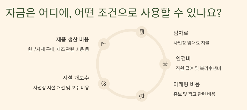 - 기업 경영 비용: 임차료, 인건비, 공과금, 마케팅 및 홍보 비용, 시설 개보수 비용 등 사업 운영에 필요한 경비