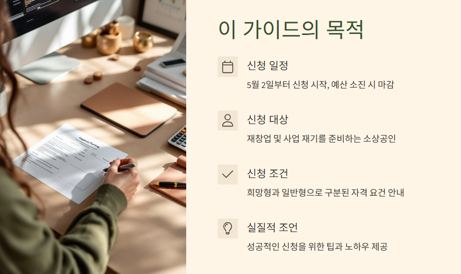 이 가이드에서는 5월 2일부터 신청이 시작되는 재도전 특별자금에 대해 여러분이 궁금해하실 모든 것을 상세하게 풀어드릴 예정입니다. 신청 대상부터 조건, 절차, 그리고 성공적인 신청을 위한 실질적인 조언까지, 이 글 하나로 재도전 특별자금 신청 준비를 완벽하게 끝낼 수 있도록 도와드리겠습니다.
