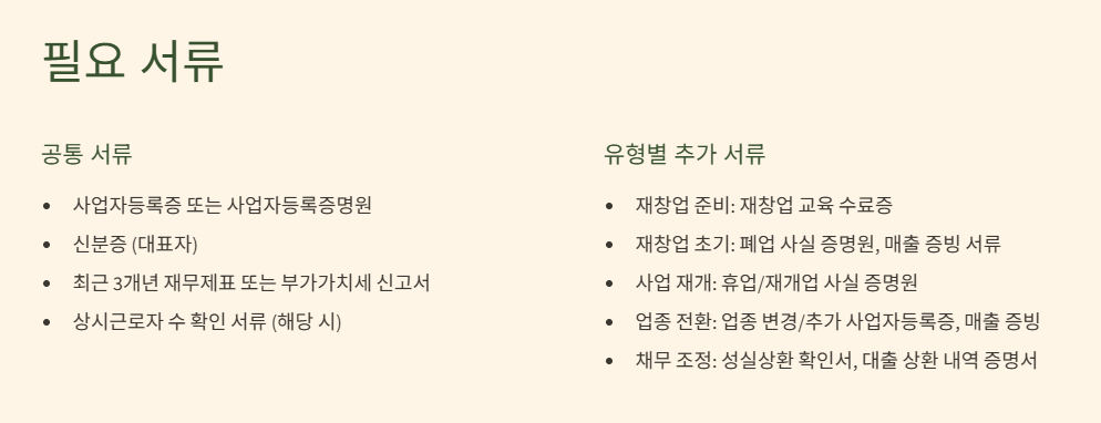 - 사업 재개: 3개월 이상 휴업했다가 다시 영업을 시작한 소상공인 (휴업 및 재개 사실 증빙 필요)