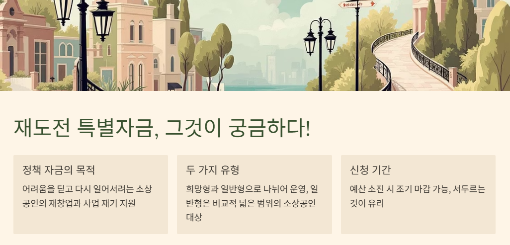 재도전 특별자금은 어려움을 딛고 다시 일어서려는 소상공인 분들의 재창업과 사업 재기를 돕기 위해 정부에서 마련한 정책 자금입니다. 크게 희망형과 일반형, 두 가지 유형으로 나뉘어 운영됩니다. 특히 일반형은 비교적 넓은 범위의 소상공인이 신청할 수 있도록 설계되어 많은 분께 기회의 문이 열려 있습니다. 하지만 기억하세요, 예산이 소진되면 신청이 조기 마감될 수 있으니 서두르는 것이 좋습니다!