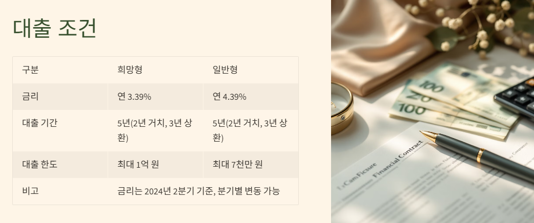 - 대출 기간: 총 5년 (처음 2년은 이자만 납부하는 거치기간, 이후 3년간 원금을 나누어 상환)