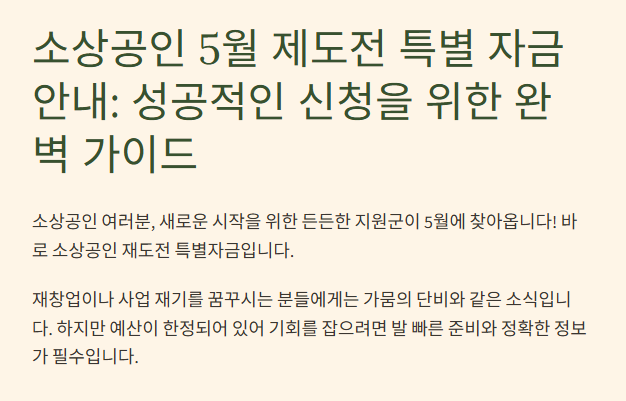 소상공인 여러분, 새로운 시작을 위한 든든한 지원군이 5월에 찾아옵니다! 바로 소상공인 재도전 특별자금인데요, 재창업이나 사업 재기를 꿈꾸시는 분들에게는 가뭄의 단비와 같은 소식일 것입니다. 하지만 이 자금은 예산이 한정되어 있어 기회를 잡으려면 발 빠른 준비와 정확한 정보가 필수입니다.
