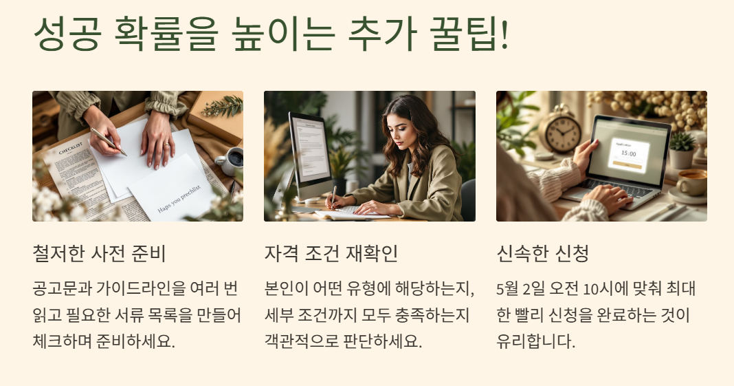 - 예산 소진이라는 변수가 있으므로, 모든 준비가 완료되었다면 신청 개시일(5월 2일) 오전 10시에 맞춰 최대한 빨리 신청을 완료하는 것이 유리합니다.