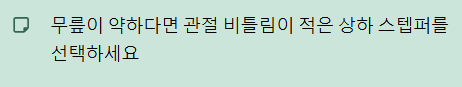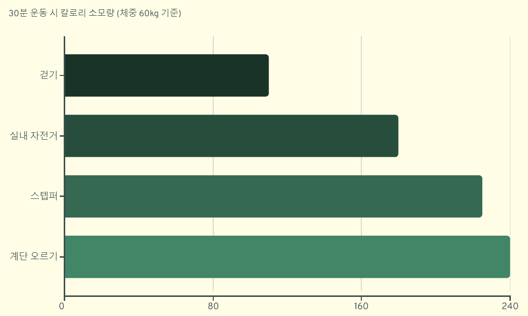 - 참고: 스텝퍼는 계단 오르기와 유사한 칼로리를 소모하지만, 내려오는 동작이 없어 관절 부담이 상대적으로 적습니다.