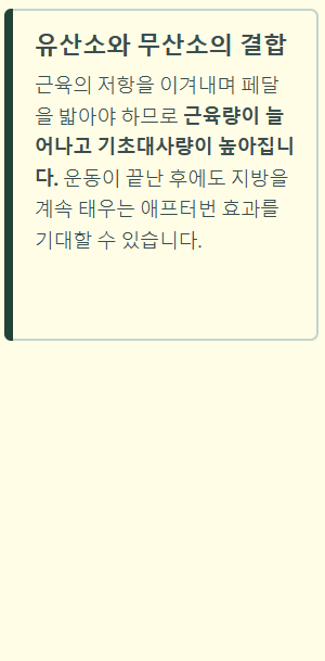 | 실내 자전거 | 보통 속도 | 약 180 kcal | 허벅지 앞쪽 |