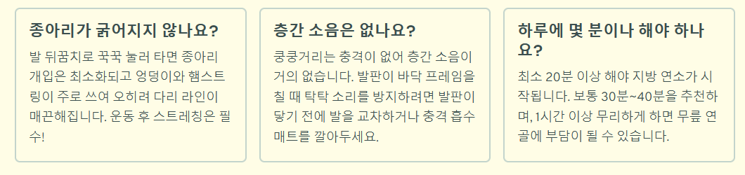 Q1. 종아리가 굵어지지 않나요? 발 앞꿈치에 힘을 주고 타면 종아리 근육(비복근)이 발달할 수 있습니다. 위에서 설명한 대로 발 뒤꿈치로 꾹꾹 눌러 타면 종아리 개입은 최소화되고 엉덩이와 햄스트링이 주로 쓰여 오히려 다리 라인이 매끈해집니다. 운동 후 스트레칭은 필수입니다.