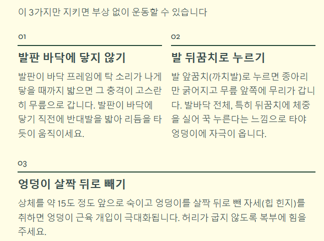 - 발 뒤꿈치로 누르기: 발 앞꿈치(까치발)로 누르면 종아리만 굵어지고 무릎 앞쪽에 무리가 갑니다. 발바닥 전체, 특히 뒤꿈치에 체중을 실어 꾹 누른다는 느낌으로 타야 엉덩이에 자극이 옵니다.