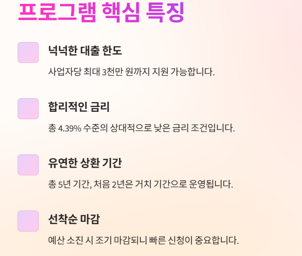 - 휴·폐업 또는 단기 재신청: 현재 휴업 또는 폐업 상태이거나, 이 프로그램을 통해 이미 대출을 받은 후 6개월이 지나지 않은 경우에는 재신청이 불가능합니다.