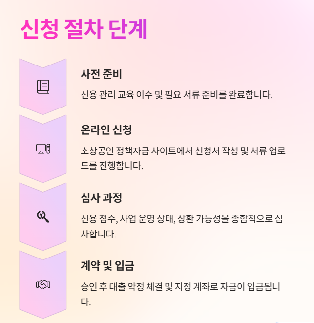 - 신청 창구: 소상공인 정책자금 공식 누리집(ols.sbiz.or.kr 등)을 통해 온라인으로만 신청 가능합니다.