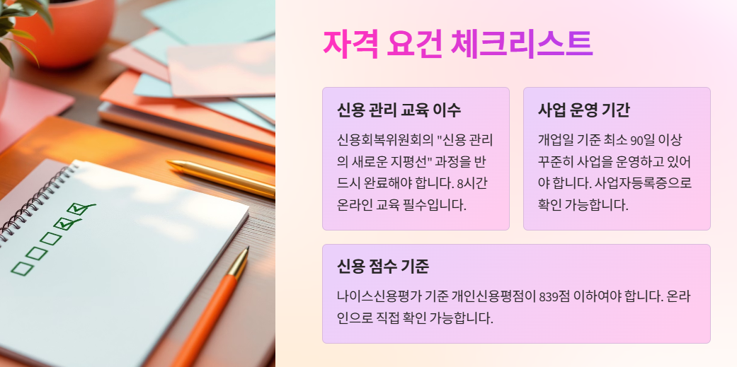 신용 취약 소상공인 자금 지원을 받기 위해서는 아래에 설명된 5가지 조건을 모두 충족해야 합니다. 하나라도 빠뜨리면 신청이 반려될 수 있으니, 각 요건을 정확히 이해하고 철저히 준비하는 것이 중요합니다. 마치 관문을 통과하듯 하나하나 점검해 보세요.