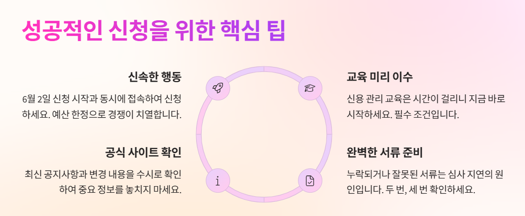- 신청 기간 준수: 직접 대출은 2025년 6월 2일부터 예산 소진 시까지입니다. 다시 한번 강조하지만, 조기 마감 가능성이 매우 높으니 최대한 서두르세요!