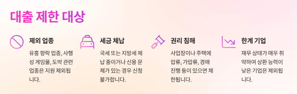 - 정책 자금 제외 업종: 유흥 향락 업종(단란주점, 유흥주점 등), 사행성 게임물 및 도박 관련 업종, 기타 국민 정서에 맞지 않는 업종 등은 지원에서 제외됩니다.