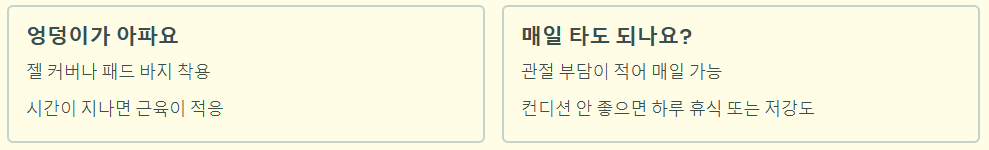 Q3. 엉덩이가 너무 아픈데 어떡하나요? 처음 타면 안장 통증이 있을 수 있습니다. 젤 커버를 씌우거나 자전거 전용 패드 바지를 입으면 통증이 훨씬 줄어듭니다. 시간이 지나면 엉덩이 근육이 적응하여 괜찮아지는 경우도 많습니다.