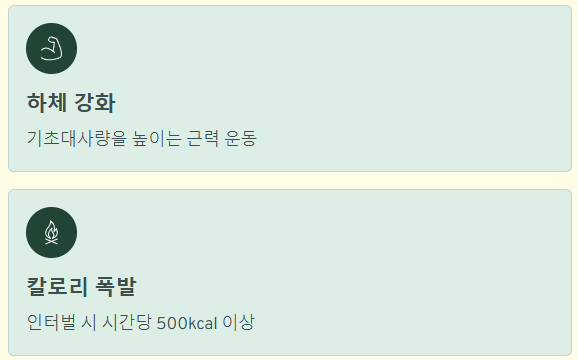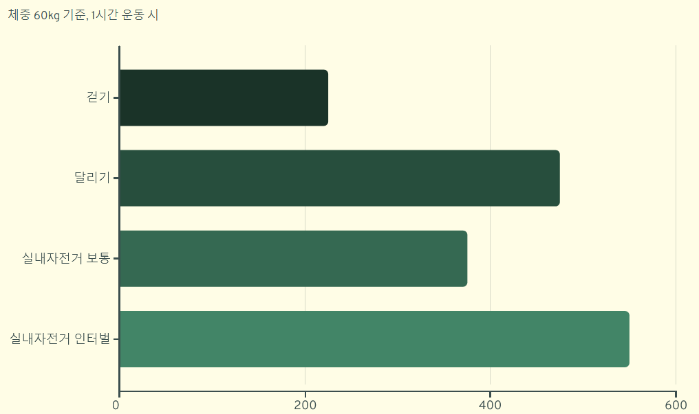 | 실내자전거 | 고강도 인터벌 | 약 500~600 kcal+ | 소음 적음 |