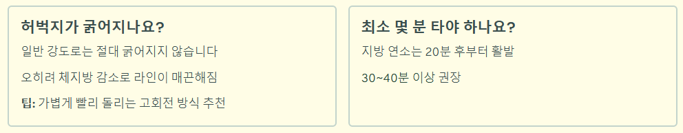 - 마무리 (3분): 천천히 페달을 밟으며 쿨다운