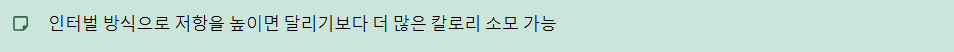 - 참고: 실내자전거는 저항(기어)을 높이고 빠르게 달리는 인터벌 방식을 적용하면 달리기보다 더 많은 칼로리를 태울 수 있습니다.