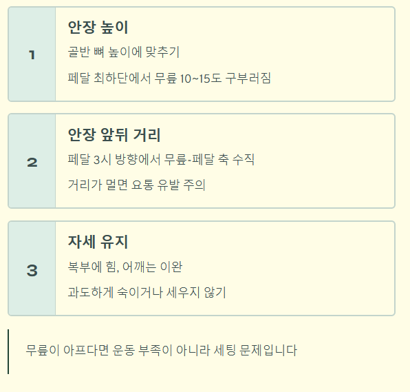 실내자전거를 타고 무릎이 아프다면 운동 부족이 아니라 세팅 문제입니다. 딱 2가지만 기억하세요.