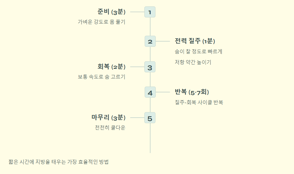 그냥 세월아 네월아 타면 운동 효과가 떨어집니다. 짧은 시간에 지방을 태우는 인터벌 루틴을 추천합니다.
