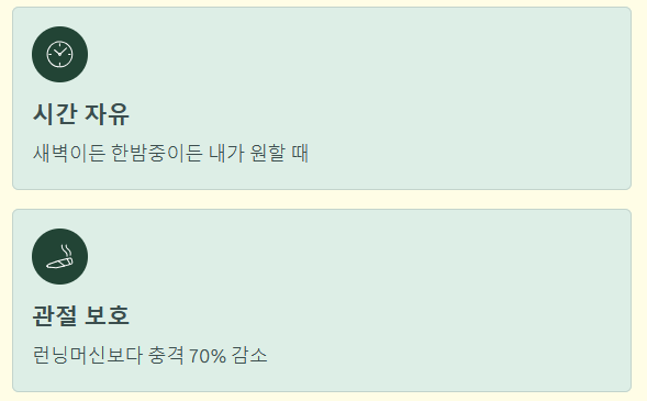 - 관절 보호: 체중이 안장에 실려 무릎과 발목에 가해지는 충격이 런닝머신보다 현저히 낮습니다.