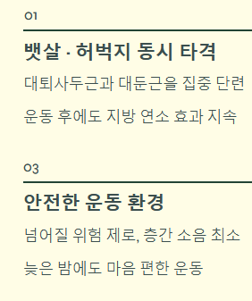 - 멀티태스킹 가능: TV나 스마트폰을 보면서 할 수 있어 운동의 지루함을 덜 수 있습니다.