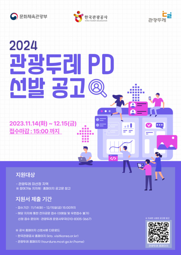 관광두레에서는 PD 선발 공고를 진행하고 있습니다. 이 공고는 지역 관광 콘텐츠를 기획하고 제작할 PD를 모집하는 것으로, 지원 기간은 2023년 11월 14일부터 12월 15일까지입니다. 모집 분야에 대한 자세한 사항은 공식 홈페이지를 통해 확인할 수 있습니다. 많은 재능 있는 분들의 지원을 기다리고 있습니다.