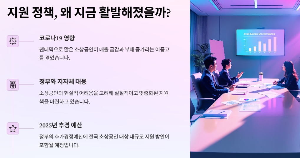 최근 몇 년간, 특히 코로나19 팬데믹을 거치면서 많은 소상공인들이 매출 급감과 부채 증가라는 이중고를 겪었습니다. 이에 정부와 각 지방자치단체는 소상공인의 현실적인 어려움을 고려하여 더욱 실질적이고 맞춤화된 지원책을 마련하는 데 힘쓰고 있습니다. 특히, 2025년 정부의 추가경정예산(추경) 논의에는 전국 소상공인을 대상으로 한 대규모 지원 방안이 포함될 것으로 예상되어, 기존 지역별 정책과 시너지를 내며 더 넓은 범위의 지원이 이루어질 것으로 기대됩니다.