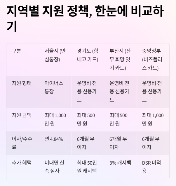| 구분 | 서울시 (안심통장) | 경기도 (힘내고 카드) | 부산시 (산무 희망 잇기 카드) | 중앙정부 (비즈플러스 카드) |