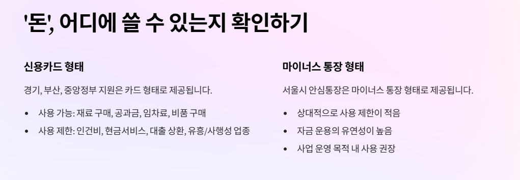 - 마이너스 통장 형태 (서울시 안심통장): 상대적으로 사용 제한이 거의 없어 자금 운용의 유연성이 높습니다. 하지만 이 역시 사업 운영 목적 내에서 사용하는 것이 바람직합니다.