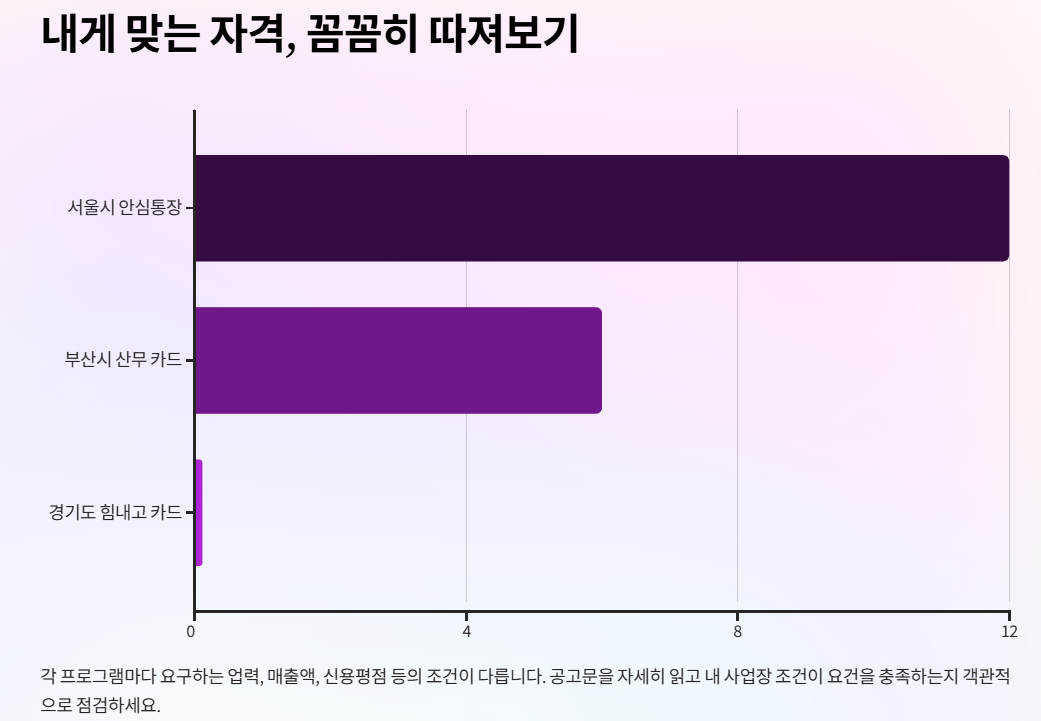 각 프로그램마다 요구하는 업력, 매출액, 신용평점 등의 조건이 모두 다릅니다. 예를 들어, 서울시 안심통장은 1년 이상 업력과 일정 수준 이상의 매출이 필요하지만, 부산시 산무 카드는 업력 6개월 이상이면 신청 가능합니다. 중앙정부 비즈플러스 카드는 특정 신용점수 구간(중신용자)을 대상으로 합니다.