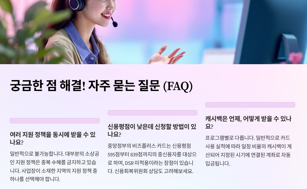 A: 신용평점이 낮더라도 포기하지 마세요. 중앙정부의 비즈플러스 카드는 신용평점 595점부터 839점까지의 중신용자를 주요 대상으로 설계되었고, DSR 미적용이라는 장점까지 있어 기존 대출이 있어도 신청 가능성이 열려 있습니다. 또한, 평소 신용점수를 꾸준히 관리하는 노력도 중요합니다. 신용회복위원회의 상담 등을 통해 개선 방안을 찾아보는 것도 방법입니다.