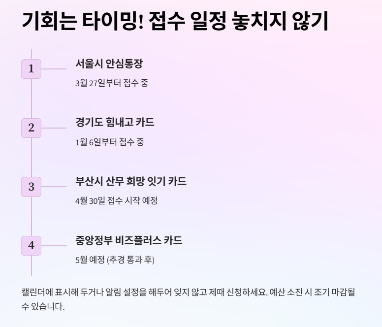 - 이미 접수 시작: 서울시 안심통장 (3월 27일~), 경기도 힘내고 카드 (1월 6일~)