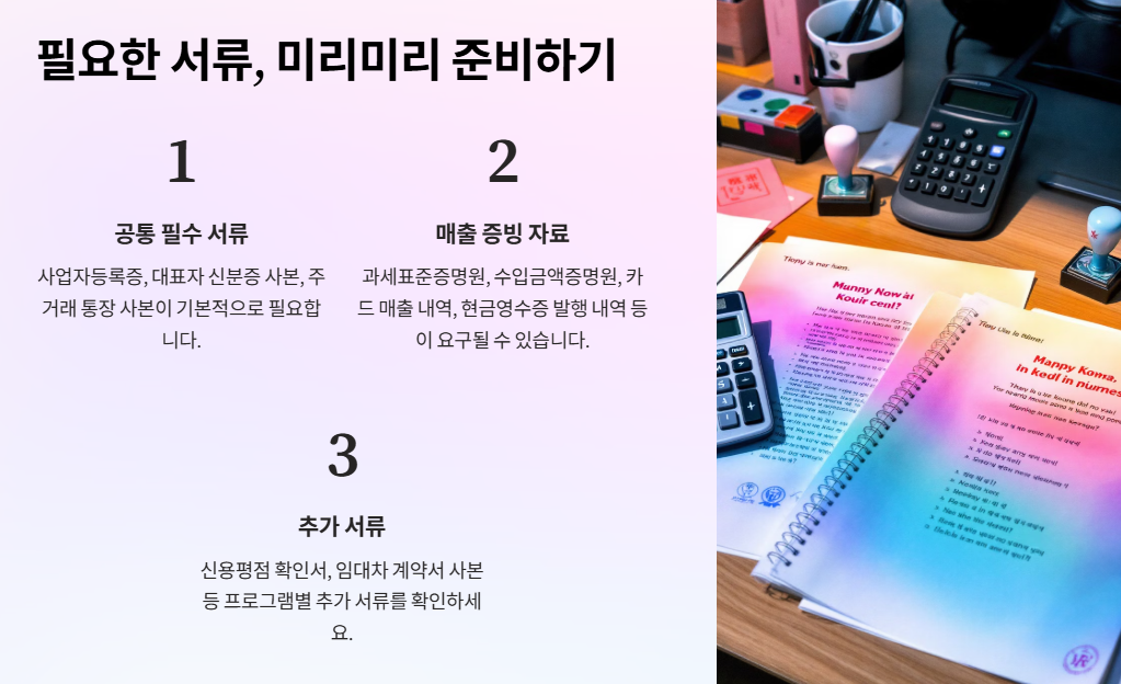 신청 전에 각 프로그램의 공고문을 자세히 읽고, 내 사업장의 조건(업력, 매출액, 대표자 신용점수 등)이 해당 요건을 충족하는지 객관적으로 점검하는 것이 첫걸음입니다.